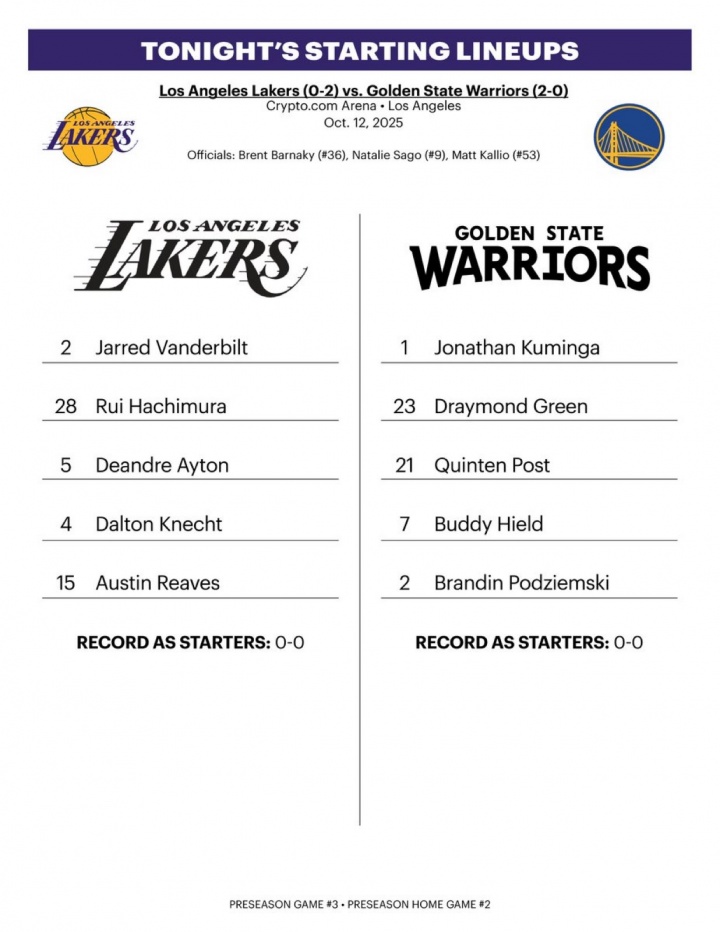 Today at 9:30, the Warriors will visit the Lakers at home for a second preseason game. Before the game, both sides announced the starting lineup for this game. Lakers: Reeves, Knecter, Hachimura, Vanderbilt, Ayton; Warriors: Podemski, Hield, Kuminga, Dream Chaser, Post.