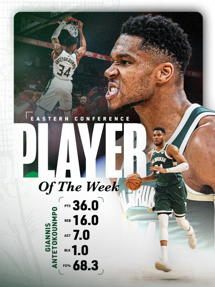 Antetokounmpo s Poster of the Week averaged 36 points, 16 rebounds and 7 assists in the first three games of the season and shot 68.3% from the field.