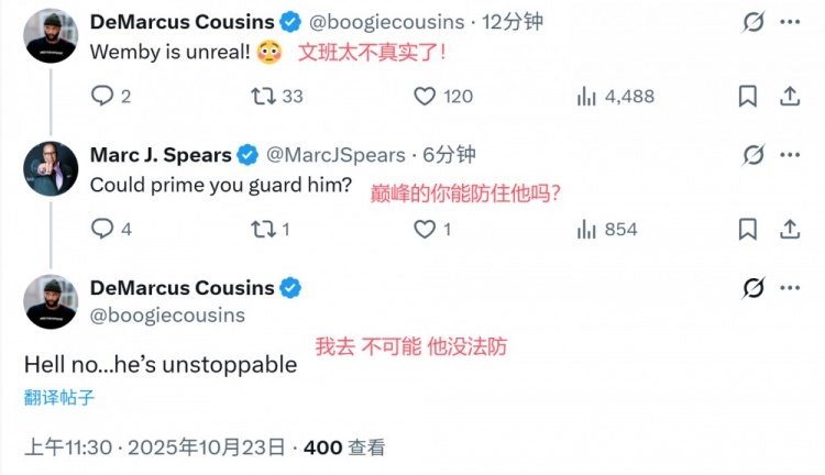 NBA regular season, Spurs vs. Mavericks.  As of the end of the third quarter, Bunyama scored 31 points, 10 rebounds and 3 blocks on 11 of 17 shots.  Former NBA player Cousins tweeted about Chinese language classes, and famous journalist Spears interacted with him. The details are as follows: