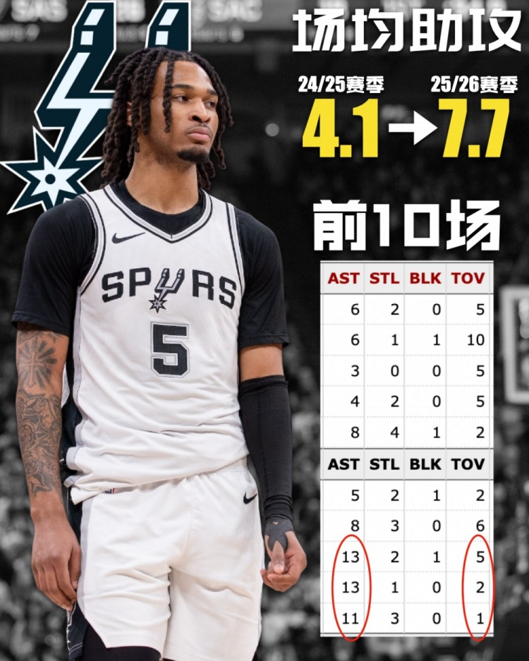 Darren Terry tried his best, lost balance and flew out of bounds, but failed to block Castle's breakthrough. Jaylen Smith, who came to help, was also feinted by Castle. The Spurs guard did not attack the basket directly. Instead, he flicked his wrist and accurately fed the ball to the mouth of Vunbanyama who was ambushing under the basket. The moment Ban Wen caught the ball, he was quite surprised. His unguarded posture told everyone what he was thinking - "Castle can actually pass this ball?" After this assist, the Spurs sounded the counterattack horn, and then Wenbanyama scored 18 points in the final quarter to help the Spurs reverse the Bulls' performance. Now Castle is already a real point guard who can be reassuring at critical moments in the game. But a year ago, people were still full of doubts about the issue of "Castle playing point guard". "The key point in evaluating Castle is, does he have the qualities to be a point guard at a higher level?" This has been the biggest question that scouts have had about Castle since he was in high school. The second-year Castle finally responded to this question that had been lingering on him for a long time. So far this season, the Spurs defender has averaged 7.7 assists per game, ranking 12th in the league. Although Castle also topped the turnover list with 4.3 turnovers per game, objectively speaking, the adaptation period at the beginning of the season and the running-in period for newcomers have raised this number. In the last three games, and after Fox returned, Castle's error control has obviously gone up to a higher level. He only made a total of 8 turnovers in the three games, but he had assists in double figures in three consecutive games, creating a total of 37 pieces of pie for his teammates. As the season progresses and Castle gets better, his assist-to-turnover ratio will only get better and better. This is a fact supported by Castle's excellent game content. If you follow the Spurs' games, you will find that Castle's maturity in handling the ball on the court is far less outrageous than the number of turnovers. On the contrary, you will feel that this 21-year-old is lifting a weight with ease. Although the Spurs have the monster Wenban, playing point guard next to Wenban is not as simple as throwing the ball into the sky and waiting for him to dunk it in... Therefore, the new Spurs coach Mickey Johnson is willing to hand over the ball to him and let him give orders. This season, Castle has become the engine of the Spurs' pick-and-roll. In this big-pot team, Castle initiated 70 pick-and-rolls, the 12th most in the league; the proportion of personal offensive methods increased from 23.7% to 34.5%. Although the pick-and-roll gain of 0.81 points per round is not a "master level", it is definitely enough. You must know that Josh Guidy, who is already the "Chicago Magic", has only earned 0.65 points from pick-and-rolls this season... It is not surprising that Castle can become a mature and seasoned commander in one summer. Because after the Spurs selected Castle last season, they made up their mind to let him play point guard, and assigned him the best teacher-the oldest point guard in the league, Chris Paul. Paul, who has seen countless geniuses and worked with countless great players, really likes this humble young man. He even felt that Castle had similar qualities to Curry. "In addition to talent and skills, excellent point guards also need mental toughness. Curry has this toughness, and so does Castle." High-ranking rookies tend to think highly of themselves, but you will never see a hint of arrogance in Castle. The reason is simple, because since childhood, Castle has grown up under a "stick education." Old Castle, who had been teammates with Duncan, became a coach after retiring, and he chose to use extremely strict methods to discipline his children. At that time, little Castle was in the rebellious period of junior high school. Although he was very dissatisfied with his father's "arbitrary" training methods, his rebellious mood only lasted for a short period of time. Because he soon figured it out, "My father did this to make me progress." At that moment, Castle saw clearly his son’s potential. “From then on, I knew that he could play for any team and any coach.” The second player in Castle's career is still a coach known for his strictness, Hurley, the head coach of the University of Connecticut men's basketball team. But after Castle watched Hurley's training method of making players run to spit water and get sprayed if they made mistakes, what he was thinking was not "get out of here quickly." Rather, "I have to get out of my comfort zone and play at the University of Connecticut so that I can make substantial progress." Even, like most Chinese parents instruct their teachers, Castle's mother reassured Hurley that they would never be dissatisfied with the harsh discipline methods. "As long as Castle makes a mistake, you can scold him if you need to, and we will never interfere." Therefore, the 19-year-old Castle learned to play in the correct way earlier than most of his peers, and also experienced the taste of winning a championship as a freshman. Playing point guard, a job that requires familiarity with the tactical manual and understanding of the game situation, seems to be a perfect fit for Castle, right? But whether he plays point guard or not does not affect Castle's value. His outstanding performance without the ball in college has trained Castle into a very advanced team snake oil. Castle's foundation is indeed very good. His height of 1.98 meters allows him to cover most ball carriers, and his 98 kilograms of weight and thick muscles make him not afraid of any confrontation. Horse steps are tight, follow the opponent, and react very quickly. This is the reason why Castle averages 2 steals per game. In this regard, he is a bit like the two-time championship veteran Holiday. There are almost no backcourt play