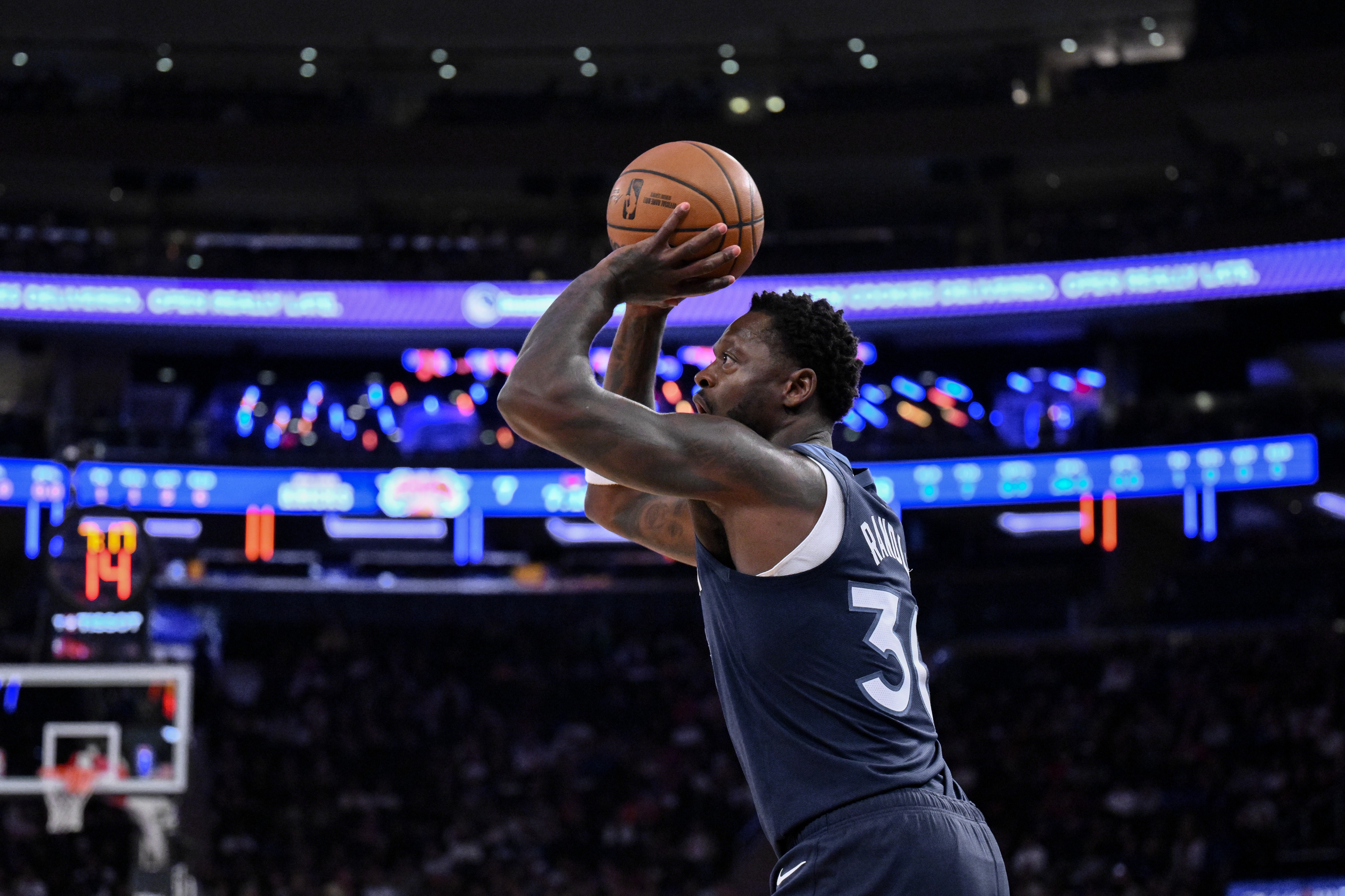 NBA Western Conference NBA Cup, the Timberwolves led the Jazz 79-45 at halftime. In the first half, Timberwolves forward Randall performed efficiently and comprehensively. He made 5 of 9 shots, 1 of 2 three-pointers, and 4 of 4 free throws in 17 minutes. He scored 15 points, 9 rebounds, 10 assists, and 1 steal. The plus-minus value was as high as +39.