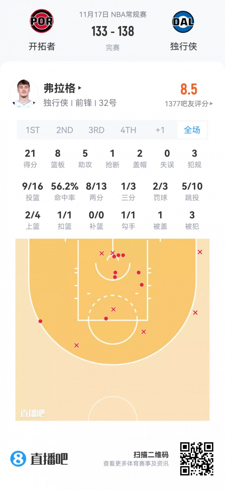 [Rookie] Flagg 21 points, 8 rebounds and 5 assists, Kobe Sanders 11 points, Richard 9 points, 7 rebounds and 5 assists