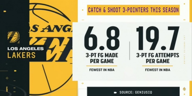 The Lakers averaged 19.7 catch-and-shoot three-pointers per game this season, making 6.8 of them, both of which are at the bottom of the league.
