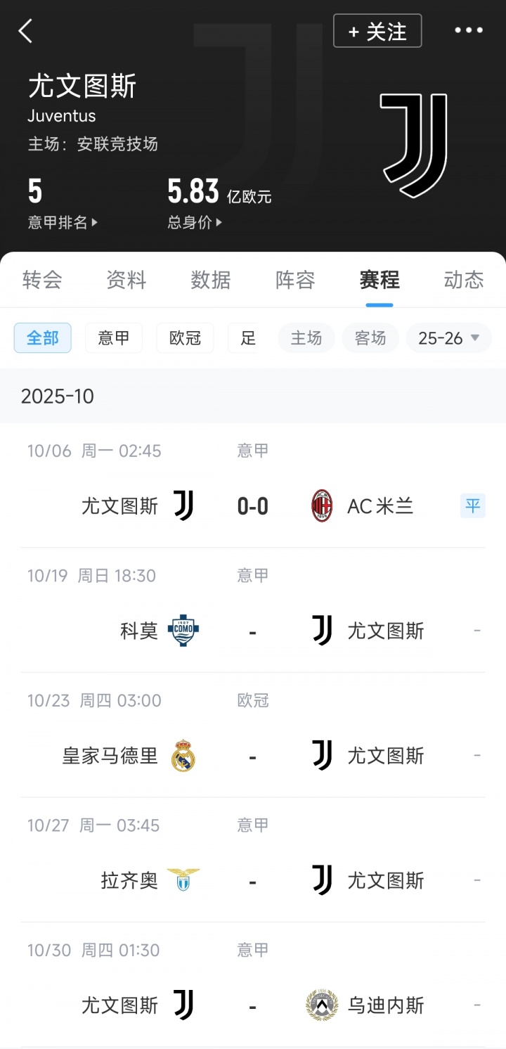 ZongSports > Football > 5 consecutive draws and three consecutive away games😣Juventus mid-to-late October schedule: Como Real Madrid Blue Eagle Black Chicken