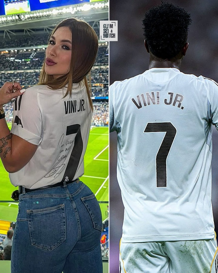 She showed off her photos of herself wearing Real Madrid jerseys and posted Vinicius' No. 7 and his autograph on the jersey.