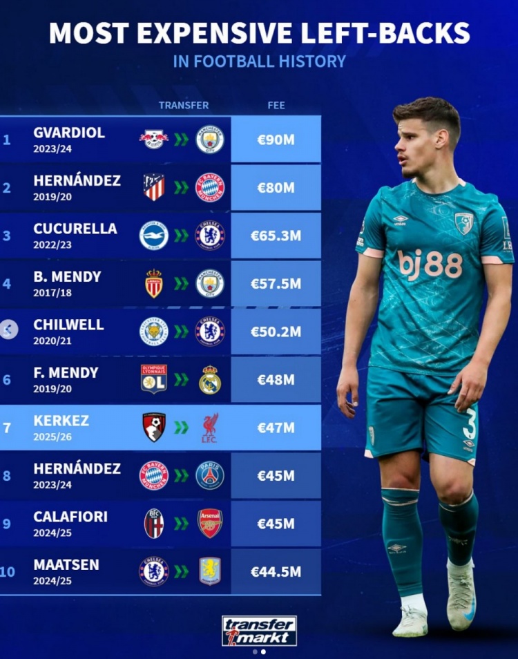 Korquez officially transferred to join Liverpool, and Germany also included the list of transfer fees for left-back players in football history, with Gvadior ranked first and Korquez ranked 7th, as follows: 1, Gvadior (Leipzig → Manchester City) 90 million Euro 2, Lucas Hernandez (Atletico Madrid → Bayern) 80 million Euro 3, Cucurella (Brighton → Chelsea) 65.3 million Euro 4, B-Menti (Monaco → Manchester City) 57.5 million Euros 5, Chilville (Leicester City → Chelsea) 50.2 million Euros 6, F-Menti (Lyon → Real Madrid) 48 million Euros 7, Colkz (Bornemouth → Liverpool) 47 million Euros 8, Lucas Hernandez (Bayern → Paris) 45 million Euros 9, Calafiori (Bologna → Arsenal) 45 million Euros 10, Mattson (Chelsea → Villa) 44.5 million Euros