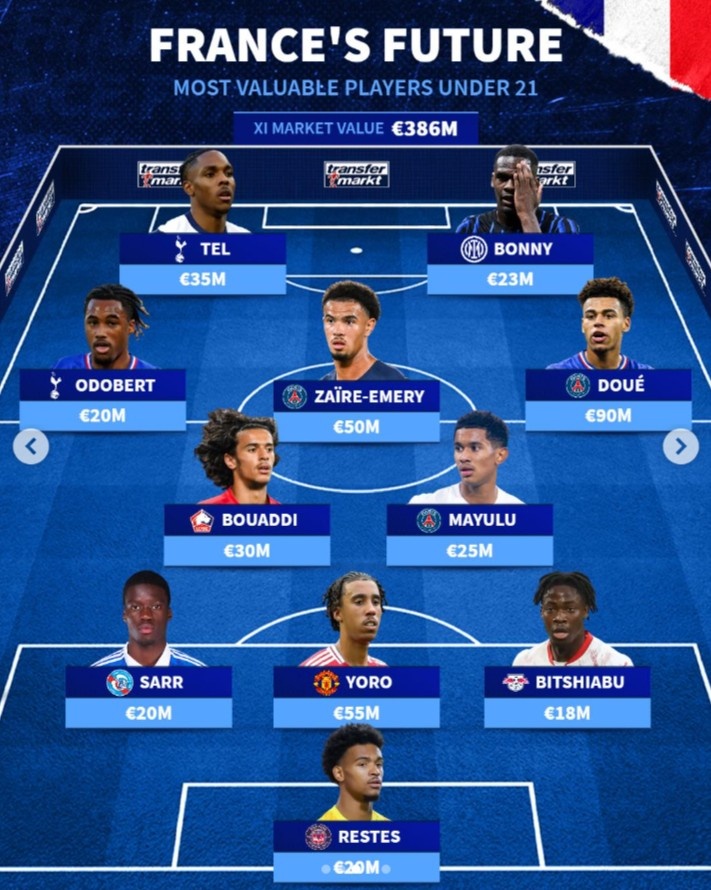 Dezhuan listed France's U21 most expensive lineup, Douai has the highest price of 90 million euros, Yoro, Bony, and Ter are also listed, and the total value of the team is 386 million euros. Attached is the most expensive lineup of France U21: Goalkeeper: Restes (Toulouse, 20 million euros) Defenders: Mamadou Sarr (Strasbourg, 20 million euros), Yoro (Manchester United, 55 million euros), Bischiab (Leipzig, 18 million euros) Midfielder: Bouadi (Lille, 30 million euros), Maioulou (Paris, 50 million euros), Odobert (Tottenham, 20 million euros), Zaire Emery (Paris, 50 million euros), Douai (Paris, 90 million euros) Forwards: Ter (Tottenham, 35 million euros), Bony (Inter Milan, 23 million euros)