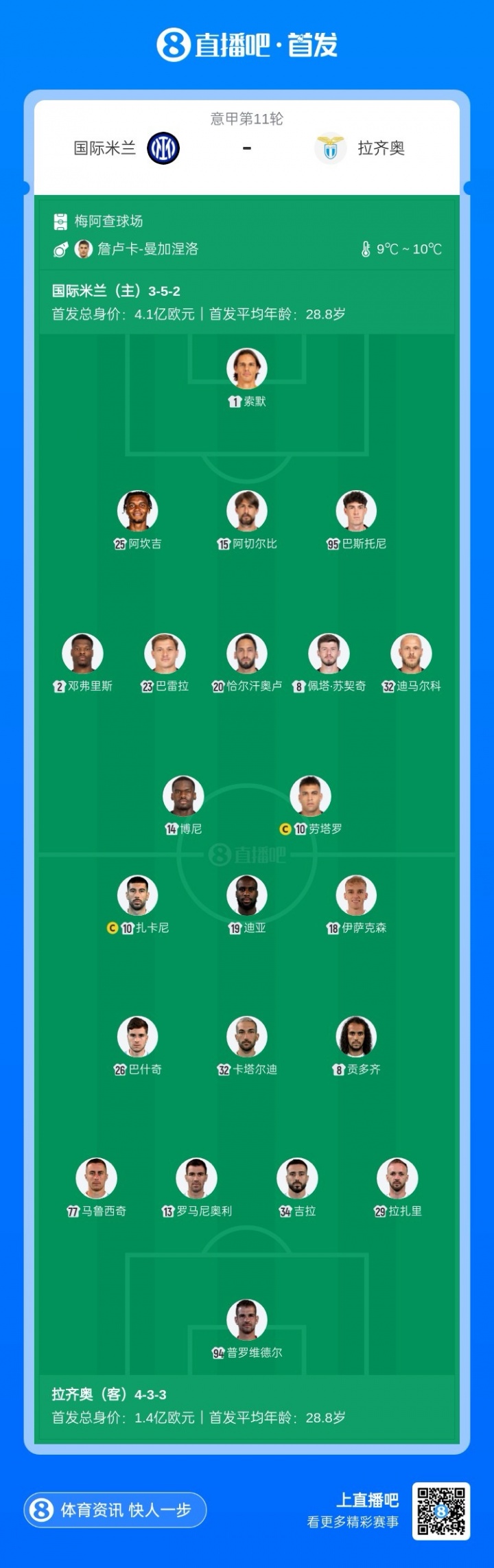 November 10 News In the 11th round of Serie A, Inter Milan’s home game against Lazio is about to begin. Started before the game. Inter Milan has a good opportunity to reach the top this round. Milan, which had already played in the same round, drew and Naples lost. Inter Milan has won consecutive league games after losing to Naples before, and will hit three consecutive victories in this round. Inter Milan starting line-up: 1-Sommer, 25-Akanji, 15-Acerbi, 95-Bastoni, 2-Dumfries, 23-Barela, 20-Calhanoglu, 8-Sucic, 32-Dimarco, 14-Boni, 10-Lautaro Inter Milan substitutes: 13-He Sepp Martinez, 40-Calligaris, 30-Augusto, 31-Bicek, 6-De Vrij, 7-Zelinski, 11-Enrique, 17-Diouf, 9-Thuram, 94-Pio Esposito Lazio starting: 94-Providel, 77-Marusic , 13-Romagnoli, 34-Gira, 29-Lazzari, 26-Bashqi, 32-Cataldi, 8-Guendouzi, 10-Zakani, 18-Isakson, 19-Dia Lazio substitutes: 35-Mandas, 55-Franetto, 25-Provsgaard, 3- Luca Pellegrini, 4-Patrick, 23-Hisay, 21-Belayane, 5-Vecino, 9-Pedro, 14-Noslin [Pre-match information]