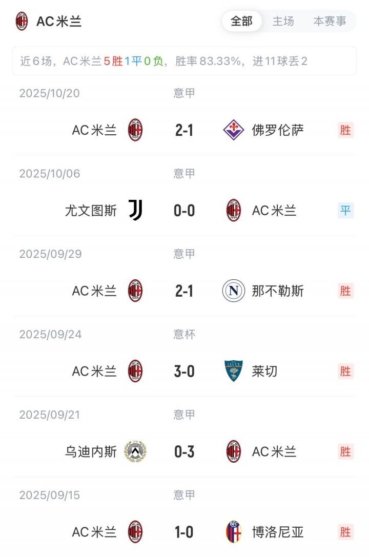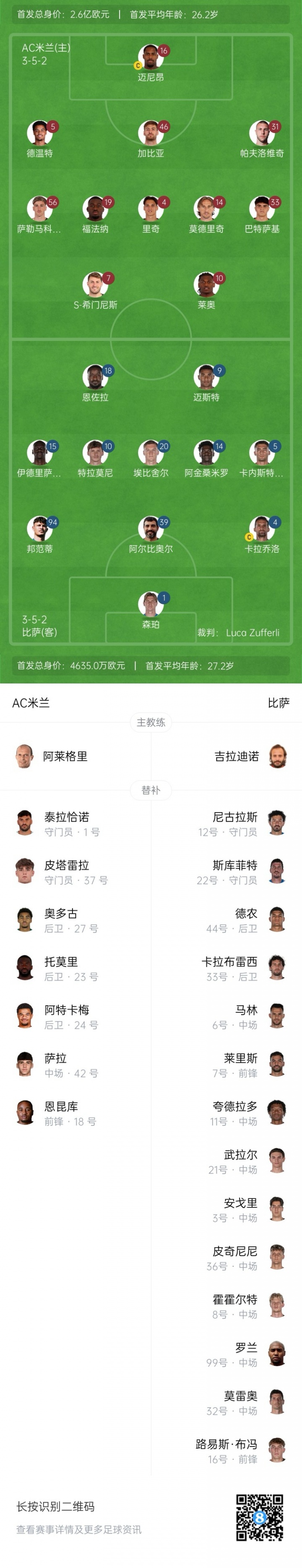 Milan faced Pisa in the 8th round of Serie A. The starting lineup was announced before the game. Modric, Leo and S. Jimenez started the game.  Milan starting: 16-Maignan, 5-Dewente, 46-Gabbia, 31-Pavlovic, 56-Salemakors, 19-Fofana, 14-Modric, 4-Rich, 33-Bartsacki, 10-Leo, 7-S Jimenez Milan Substitutes: 1-Terraciano, 37-Pitarella, 18-Nkunku, 23-Tomori, 24-Atkame, 27-Odogu, 42-Sala  Pisa starting: 1-Semper, 4-Caracciolo, 39-Albiol, 5-Canestrelli, 15-Idrissa· Toure, 14-Akinsamiro, 20-Ebisher, 94-Bonfanti, 10-Tramoni, 9-Maister, 18-Nzola   Pisa Substitute: 12-David Nicholas, 22-Skufet, 33-Calabresi, 44-Denon, 3-Angoli, 11 - Cuadrado, 8-Hoholt, 7-Leiris, 6-Marius Marin, 36-Piccinini, 21-Vural, 16-Louis Buffon, 99-Roland, 32-Moreo   Milan leads Serie A with 5 wins, 1 draw and 1 loss, and Pisa ranks at the bottom with 3 draws and 4 losses.