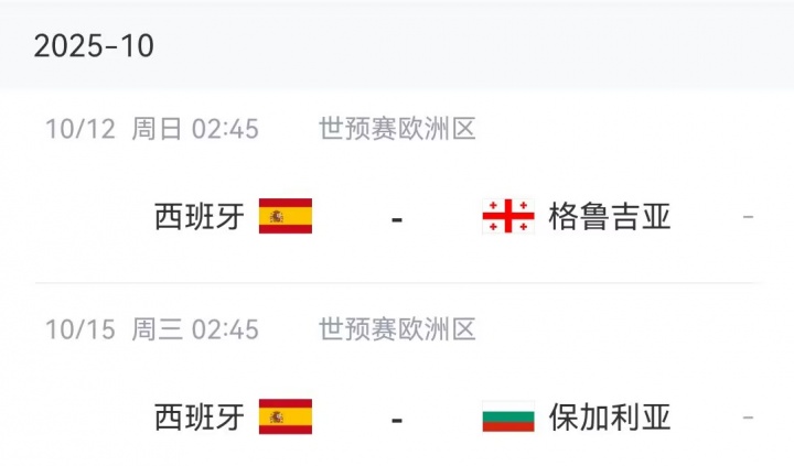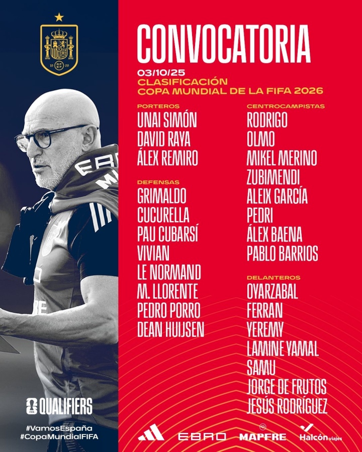 The Spanish team officially announced the latest national team roster, led by Yamal and Pedri, and Suvimenti, Heisen and others were on the list. Kavajal, Fermin and others were eliminated due to injuries. This group of players will accompany Spain to the European Regional Games in October. Spain list: Goalkeepers: Unai Simon (Bilbao), Raya (Arsenal), Remiro (Real Sociedad) Defenders: Grimaldo (Leverkusen), Cucurella (Chelsea), Kubrasi (Barcelona), Vivian (Bilbao), Le Norman (Atletico Madrid), Marcos Llorente (Atletico Madrid), Polo (Tottenham), Geisen (Real Madrid) Midfielders: Rodri (Manchester City), Olmo (Barcelona), Merino (Arsenal), Suvimenti (Arsenal) ), Alex Garcia (Leverkusen), Pedri (Barcelona), Alex Baenna (Atletico Madrid), Barrios (Atletico Madrid) Forwards: Oyasabal (Real Sociedad), Feran (Barcelona), Pino (Crystal Palace), Samu Agjova (Porto), Yamal (Barcelona), De Vrutos (Vallecano), Rodriguez (Como) Spain will play two World Cup qualifiers this month: Georgia will face at home on October 12 and Bulgaria on October 15. Currently, Spain ranked 1st in Group E in the World Cup qualifiers. Spain October Schedule↓ World-time qualifiers European Group E standings↓