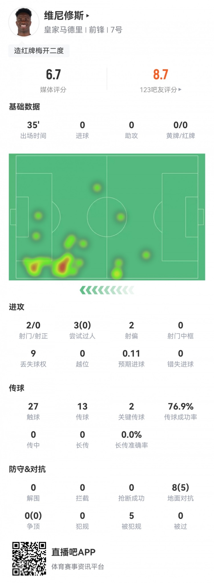 ZongSports > Football > Vinicius statistics: The substitute was fouled 5 times and received two reds in 35 minutes, and had 2 key passes with a rating of 6.7